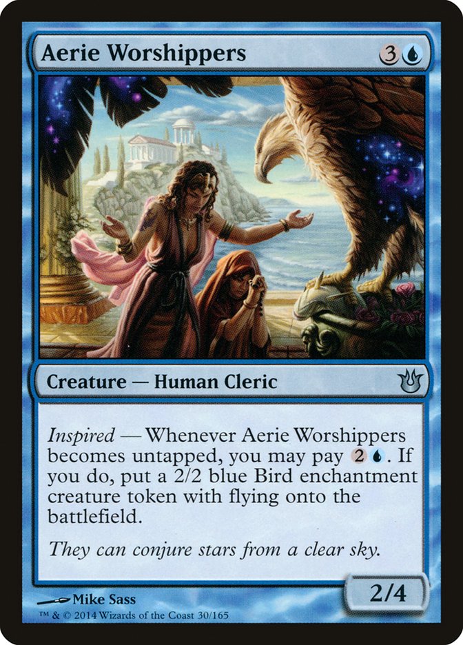 Inspired — Whenever Aerie Worshippers becomes untapped, you may pay {2}{U}. If you do, create a 2/2 blue Bird enchantment creature token with flying.