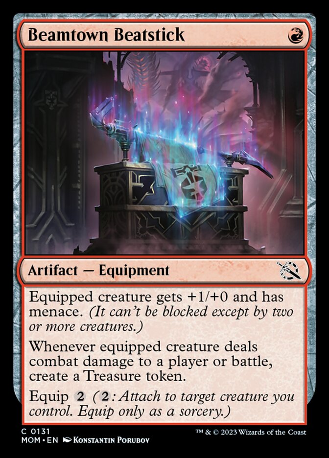 Equipped creature gets +1/+0 and has menace. (It can't be blocked except by two or more creatures.) Whenever equipped creature deals combat damage to a player or battle, create a Treasure token. Equip {2} ({2}: Attach to target creature you control. Equip only as a sorcery.)