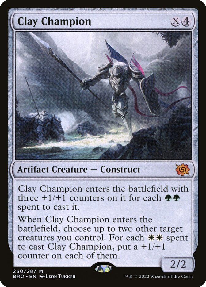 Clay Champion enters the battlefield with three +1/+1 counters on it for each {G}{G} spent to cast it. When Clay Champion enters the battlefield, choose up to two other target creatures you control. For each {W}{W} spent to cast Clay Champion, put a +1/+1 counter on each of them.