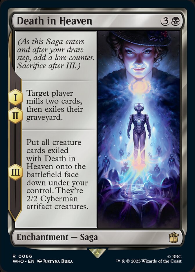 (As this Saga enters and after your draw step, add a lore counter. Sacrifice after III.) I,II - Target player mills two cards, then exiles their graveyard. III - Put all creature cards exiled with Death in Heaven onto the battlefield face down under your control. They're 2/2 Cyberman artifact creatures.