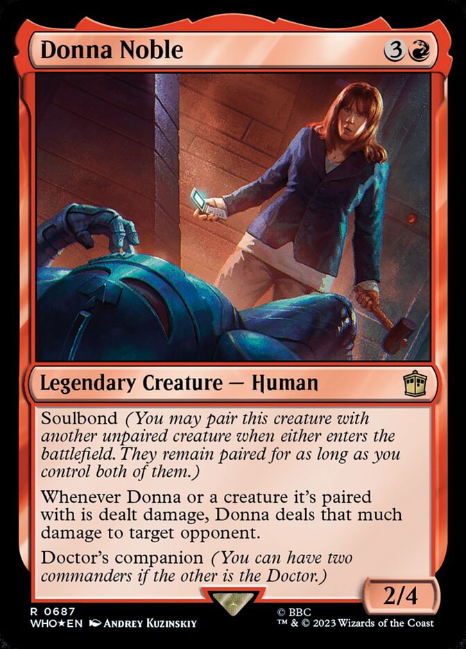 Soulbond (You may pair this creature with another unpaired creature when either enters the battlefield. They remain paired for as long as you control both of them.) Whenever Donna or a creature it's paired with is dealt damage, Donna deals that much damage to target opponent. Doctor's companion (You can have two commanders if the other is the Doctor.)