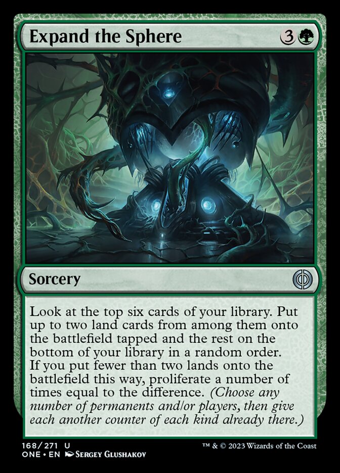 Look at the top six cards of your library. Put up to two land cards from among them onto the battlefield tapped and the rest on the bottom of your library in a random order. If you put fewer than two lands onto the battlefield this way, proliferate a number of times equal to the difference. (Choose any number of permanents and/or players, then give each another counter of each kind already there.)