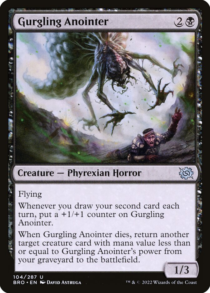 Flying Whenever you draw your second card each turn, put a +1/+1 counter on Gurgling Anointer. When Gurgling Anointer dies, return another target creature card with mana value less than or equal to Gurgling Anointer's power from your graveyard to the battlefield.