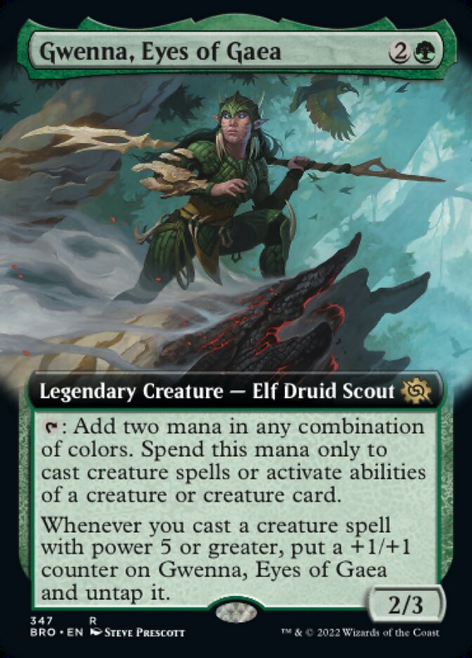 {T}: Add two mana in any combination of colors. Spend this mana only to cast creature spells or activate abilities of a creature or creature card. Whenever you cast a creature spell with power 5 or greater, put a +1/+1 counter on Gwenna, Eyes of Gaea and untap it.