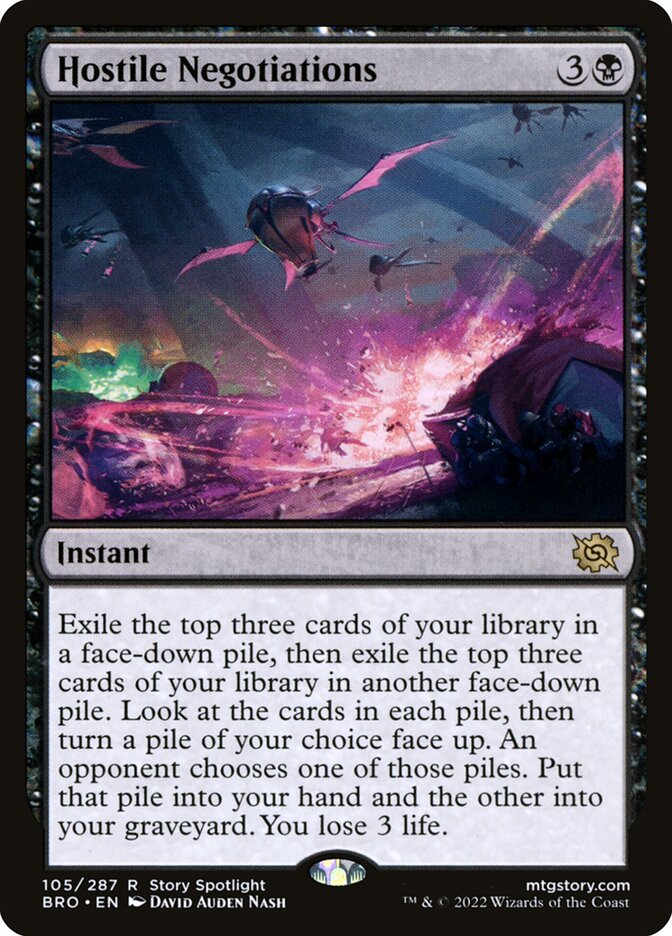 Exile the top three cards of your library in a face-down pile, then exile the next top three cards of your library in another face-down pile. Look at the cards in each pile, then turn a pile of your choice face up. An opponent chooses one of those piles. Put all cards in the chosen pile into your hand and the rest into your graveyard. You lose 3 life.