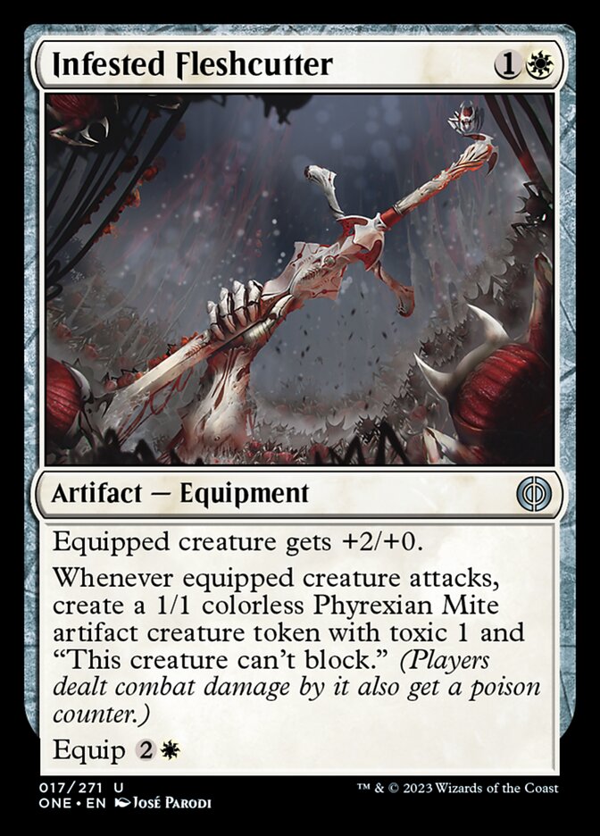 Equipped creature gets +2/+0. Whenever equipped creature attacks, create a 1/1 colorless Phyrexian Mite artifact creature token with toxic 1 and "This creature can't block." (Players dealt combat damage by it also get a poison counter.) Equip {2}{W}