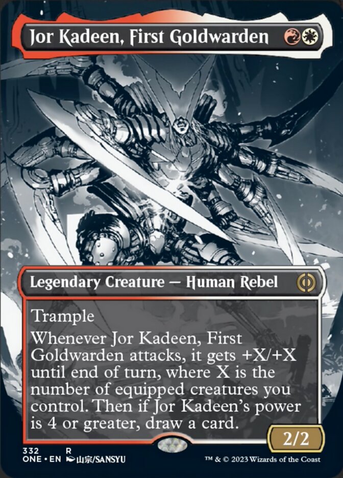 Trample Whenever Jor Kadeen, First Goldwarden attacks, it gets +X/+X until end of turn, where X is the number of equipped creatures you control. Then if Jor Kadeen's power is 4 or greater, draw a card.