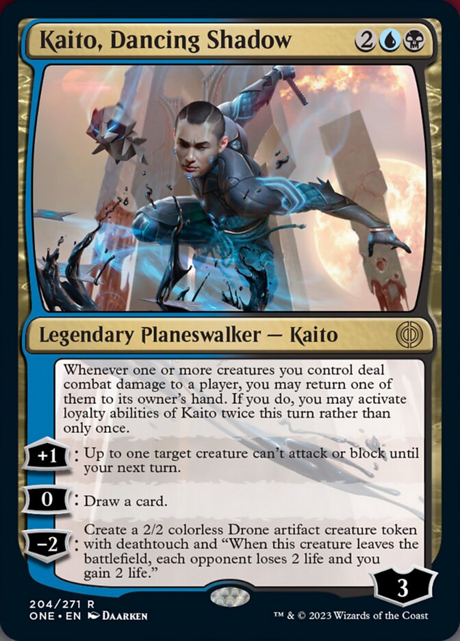 Whenever one or more creatures you control deal combat damage to a player, you may return one of them to its owner's hand. If you do, you may activate loyalty abilities of Kaito twice this turn rather than only once. +1: Up to one target creature can't attack or block until your next turn. 0: Draw a card. −2: Create a 2/2 colorless Drone artifact creature token with deathtouch and "When this creature leaves the battlefield, each opponent loses 2 life and you gain 2 life."