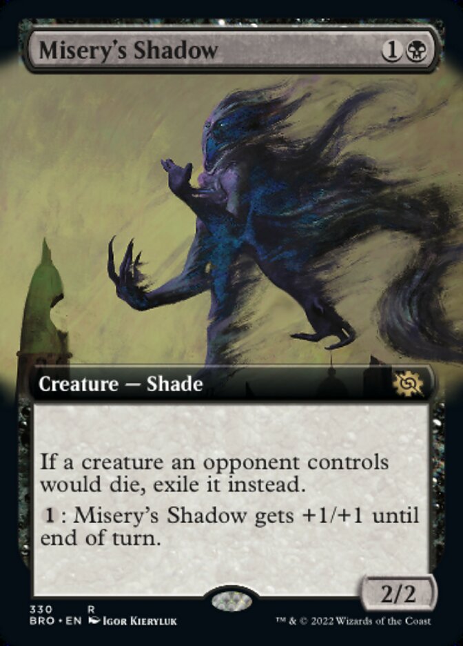 If a creature an opponent controls would die, exile it instead. {1}: Misery's Shadow gets +1/+1 until end of turn.