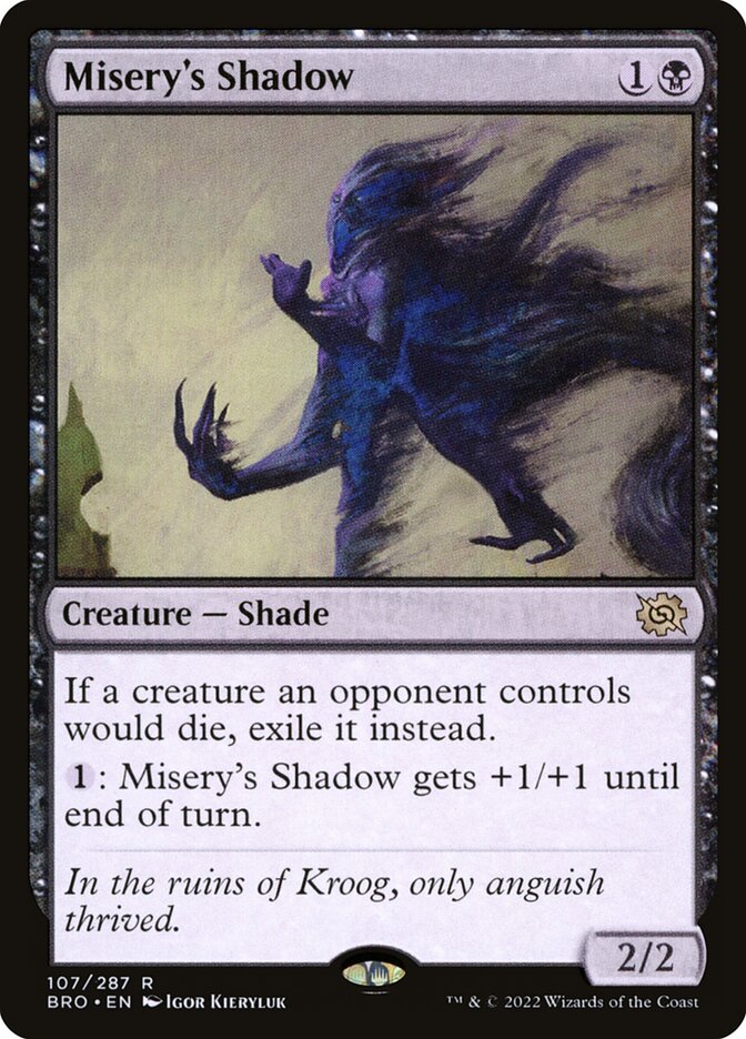 If a creature an opponent controls would die, exile it instead. {1}: Misery's Shadow gets +1/+1 until end of turn.