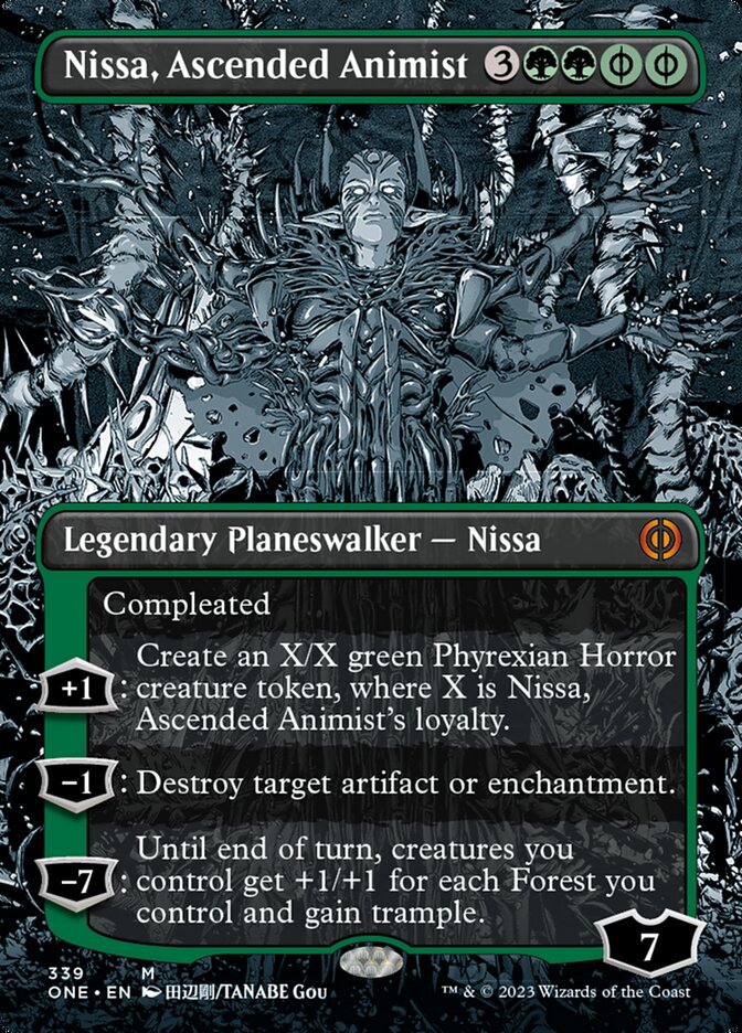 Compleated ({G/P} can be paid with {G} or 2 life. For each {G/P} paid with life, this planeswalker enters with two fewer loyalty counters.) +1: Create an X/X green Phyrexian Horror creature token, where X is Nissa, Ascended Animist's loyalty. −1: Destroy target artifact or enchantment. −7: Until end of turn, creatures you control get +1/+1 for each Forest you control and gain trample.