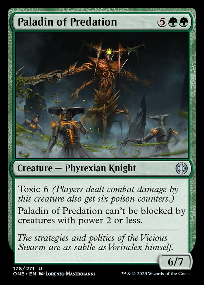 Toxic 6 (Plavers dealt combat damage by this creature also get six poison counters.) Paladin of Predation can't be blocked by creatures with power 2 or less.