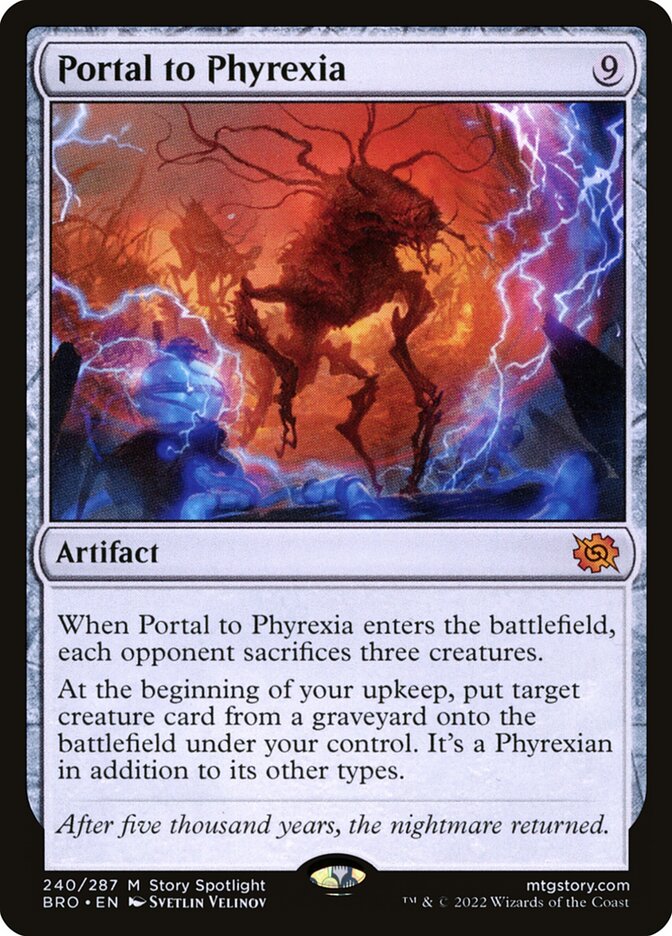 When Portal to Phyrexia enters the battlefield, each opponent sacrifices three creatures. At the beginning of your upkeep, put target creature card from a graveyard onto the battlefield under your control. It's a Phyrexian in addition to its other types.