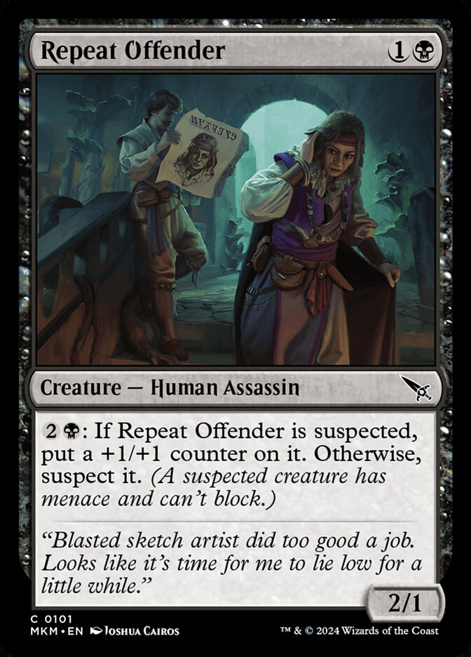 {2}{B}: If Repeat Offender is suspected, put a +1/+1 counter on it. Otherwise, suspect it. (A suspected creature has menace and can't block.)