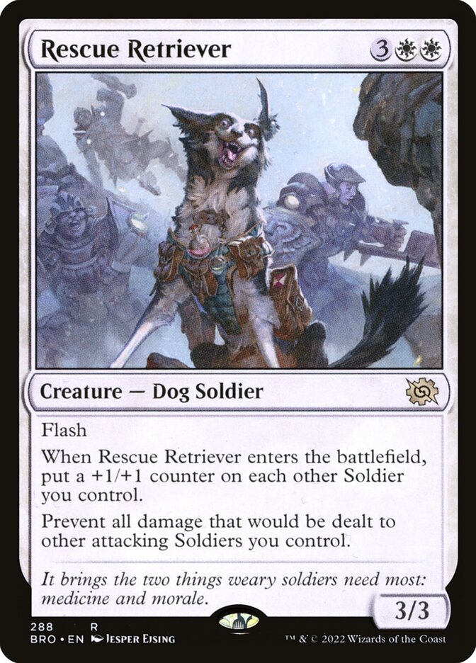 Flash When Rescue Retriever enters the battlefield, put a +1/+1 counter on each other Soldier you control. Prevent all damage that would be dealt to other attacking Soldiers you control.