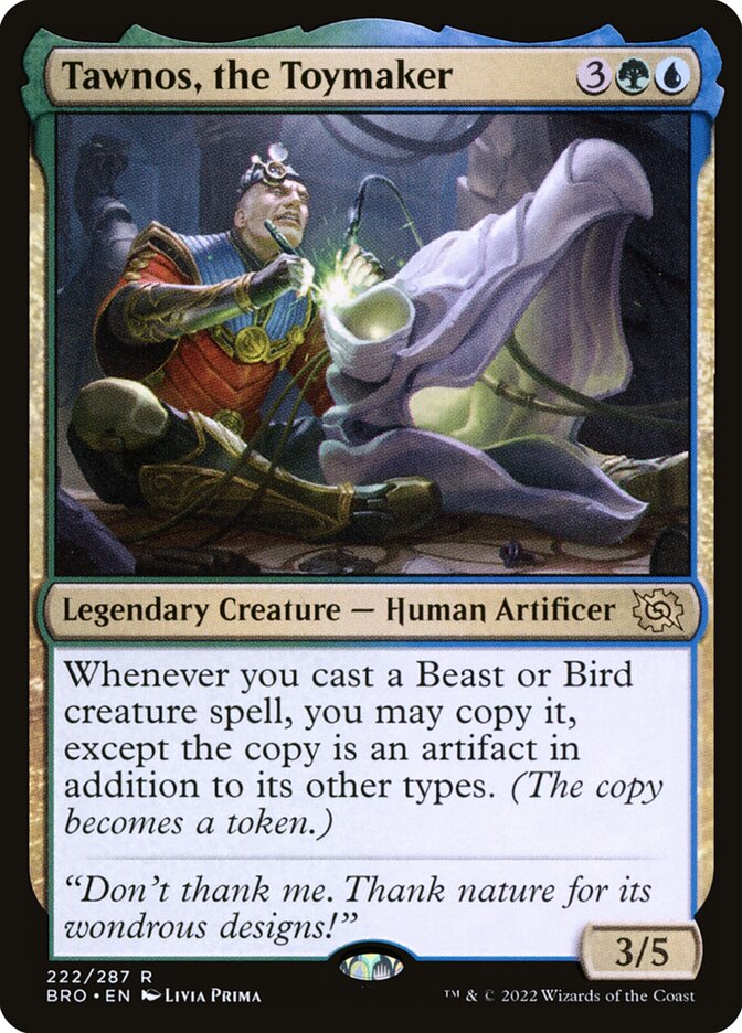 Whenever you cast a Beast or Bird creature spell, you may copy it, except the copy is an artifact in addition to its other types. (The copy becomes a token.)