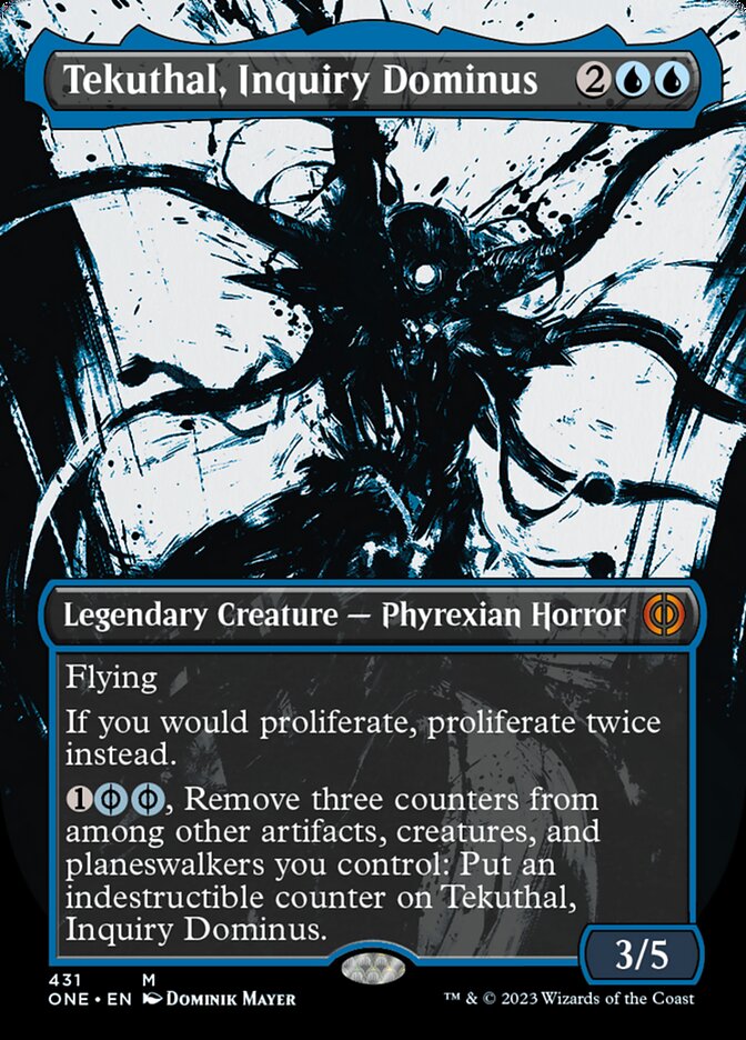 Flying If you would proliferate, proliferate twice instead. {1}{U/P}{U/P}, Remove three counters from among other artifacts, creatures, and planeswalkers you control: Put an indestructible counter on Tekuthal, Inquiry Dominus. ({U/P} can be paid with either {U} or 2 life.)