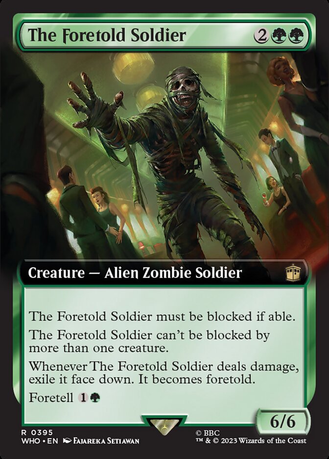 The Foretold Soldier must be blocked if able. The Foretold Soldier can't be blocked by more than one creature. Whenever The Foretold Soldier deals damage, exile it face down. It becomes foretold. Foretell {1}{G} (During your turn, you may pay {2} and exile this card from your hand face down. Cast it on a later turn for its foretell cost.)