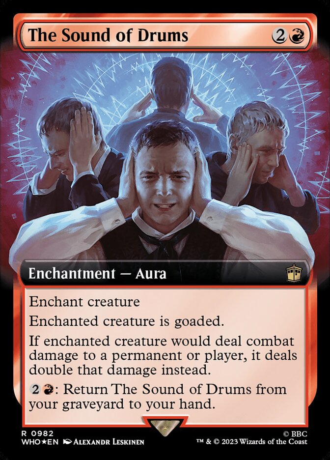 Enchant creature Enchanted creature is goaded. If enchanted creature would deal combat damage to a permanent or player, it deals double that damage instead. {2}{R}: Return The Sound of Drums from your graveyard to your hand.