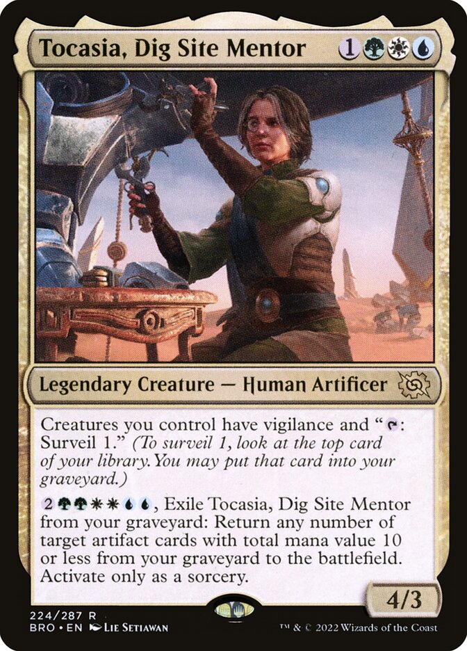 Creatures you control have vigilance and "{T}: Surveil 1." (To surveil 1, look at the top card of your library. You may put that card into your graveyard.) {2}{G}{G}{W}{W}{U}{U}, Exile Tocasia, Dig Site Mentor from your graveyard: Return any number of target artifact cards with total mana value 10 or less from your graveyard to the battlefield. Activate only as a sorcery.